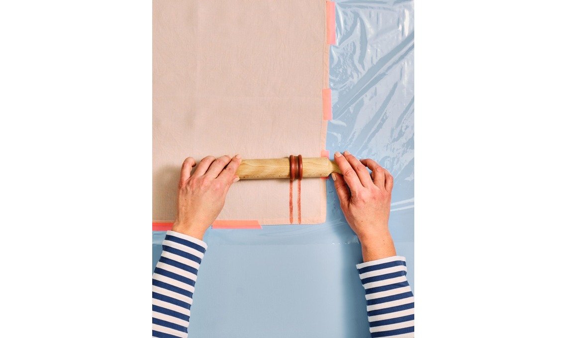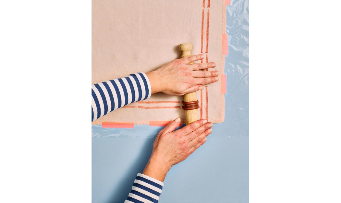 5 Prosegui la timbratura sul lato opposto. Per avere linee diritte fai coincidere il bordo del matterello con la cucitura del tovagliolo.