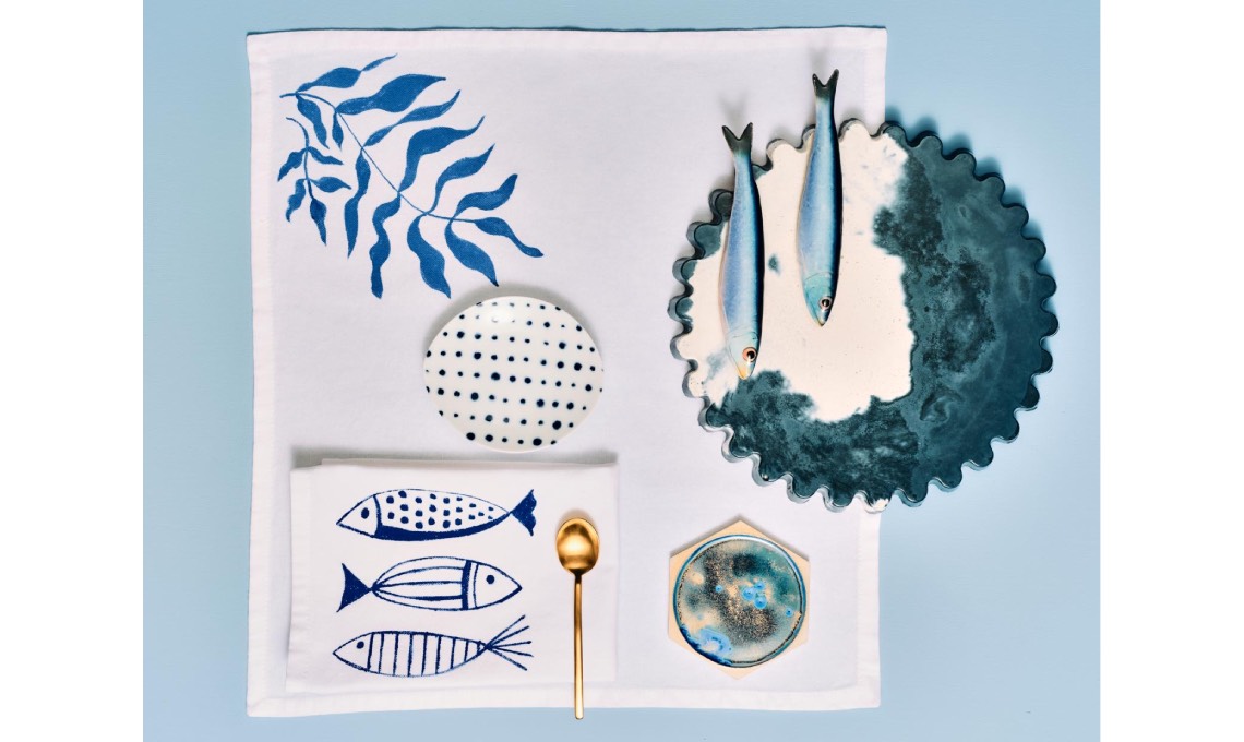IDEA 1: CON LA PENNA PER TESSUTO. Vassoio sagomato in cemento bicolore [Emporio Mikica], sardine in ceramica [Etsy], sottobicchiere in grès smaltato a immersione