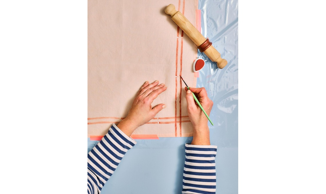 6 Con il pennellino a punta fine rifinisci i punti di giunzione. Stira il tovagliolo al contrario, con ferro caldo a 150 °C senza vapore.