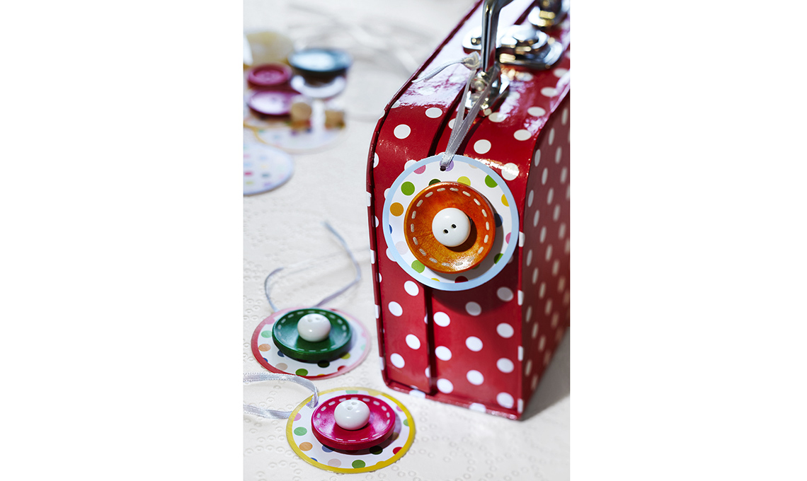 - È charms-mania! I ciondoli sono realizzati con bottoni incollati su un cerchio di cartoncino a pois. Con la stessa tecnica puoi creare dei portachiavi.