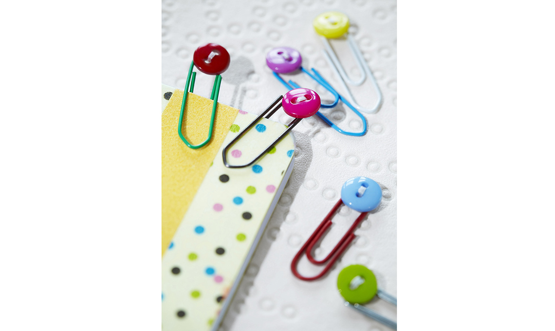 - Le clip per le stationery addicted sono DIY: qui i bottoni sono cuciti ai fermagli colorati.