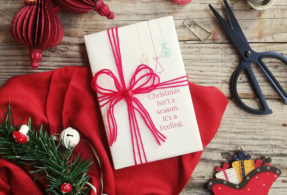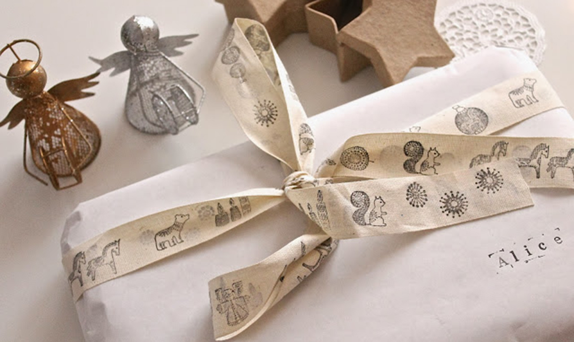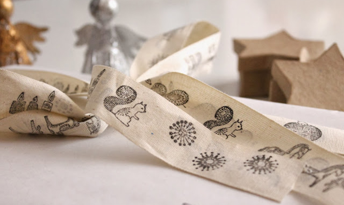 - Possiamo utilizzare dei timbri natalizi per decorare una fettuccia di cotone con cui legare i pacchetti (e che potrà essere riutilizzata).