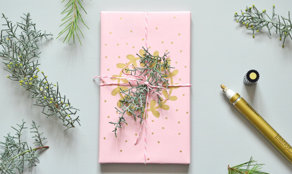 Ghirlande e rami verdi danno subito un’aria di festa, che siano veri o disegnati. In questa proposta c’è un mix di entrambi: sulla carta rosa è disegnata una ghirlanda di foglie stilizzata, tra piccoli pois dorati, mentre con lo spago bakers twine è stato aggiunto un rametto fresco di cipresso.