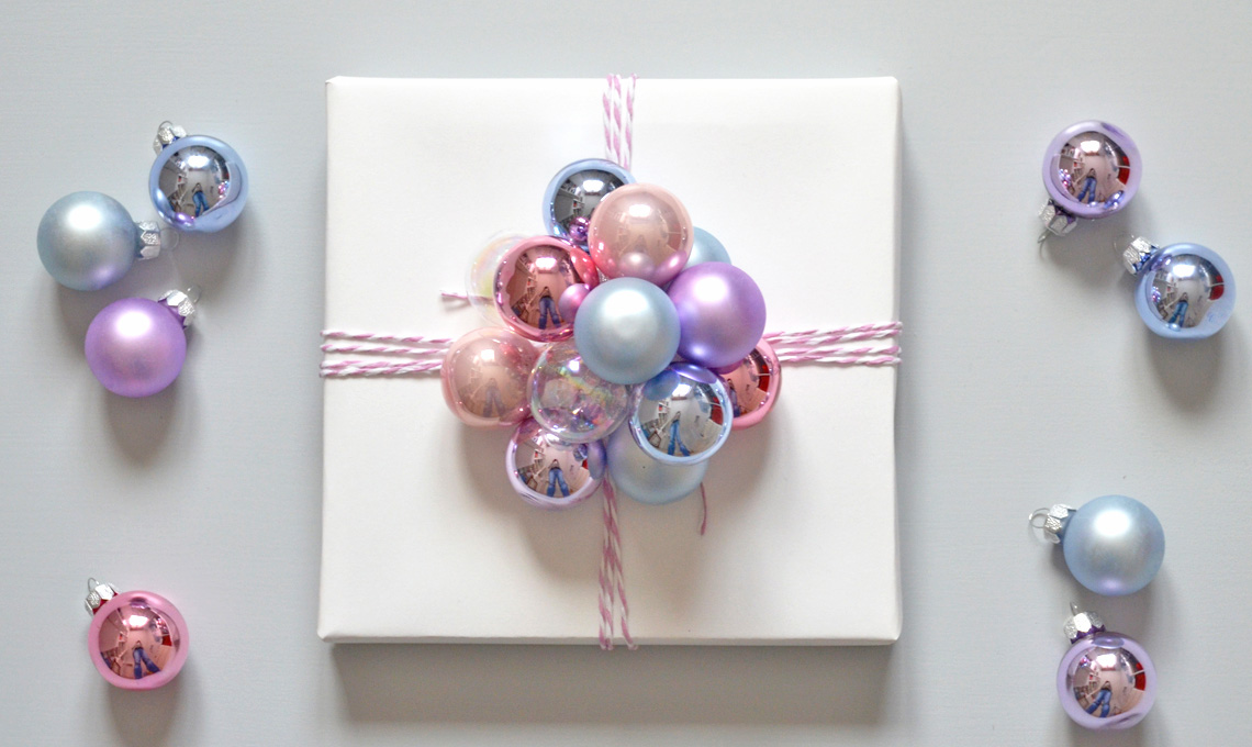 Le palline di vetro non sono solo per l’albero di Natale: in formato mini, sono perfette per trasformare un semplice pacchetto avvolto nella carta da pacco bianca. L’importante è scegliere con cura la palette di colori e accostare finiture differenti, dal lucido al satinato.