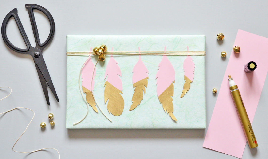 La base del pacchetto è una carta verde menta, decorata da piume ritagliate nel cartoncino rosa e colorate con un pennarello a vernice oro. Per completare, bastano qualche giro di spago naturale e un grappolo di campanelli dorati.