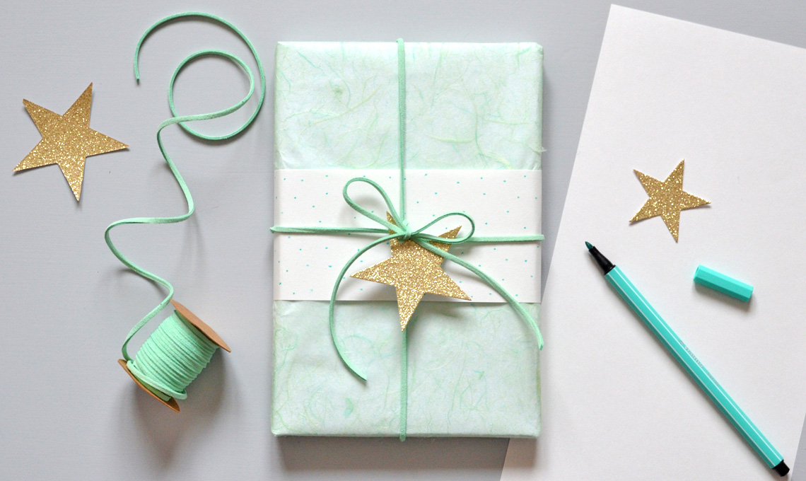 Il verde menta è protagonista assoluto di questo pacchetto. La base è tinta unita, decorata con una striscia di carta bianca su cui sono stati disegnati minuscoli pois dello stesso colore. Una stella dorata ritagliata nel cartoncino glitter, e fissata con un nastrino in tinta, completa la confezione con un tocco scintillante che fa subito festa!