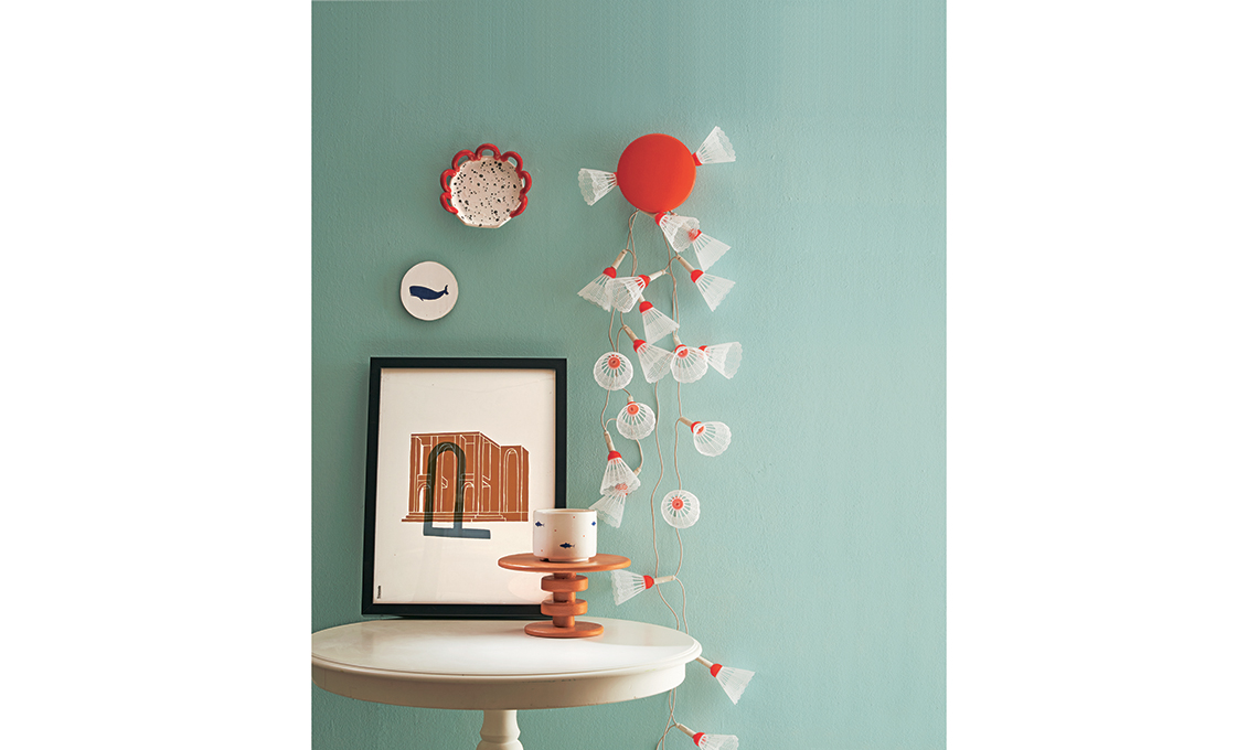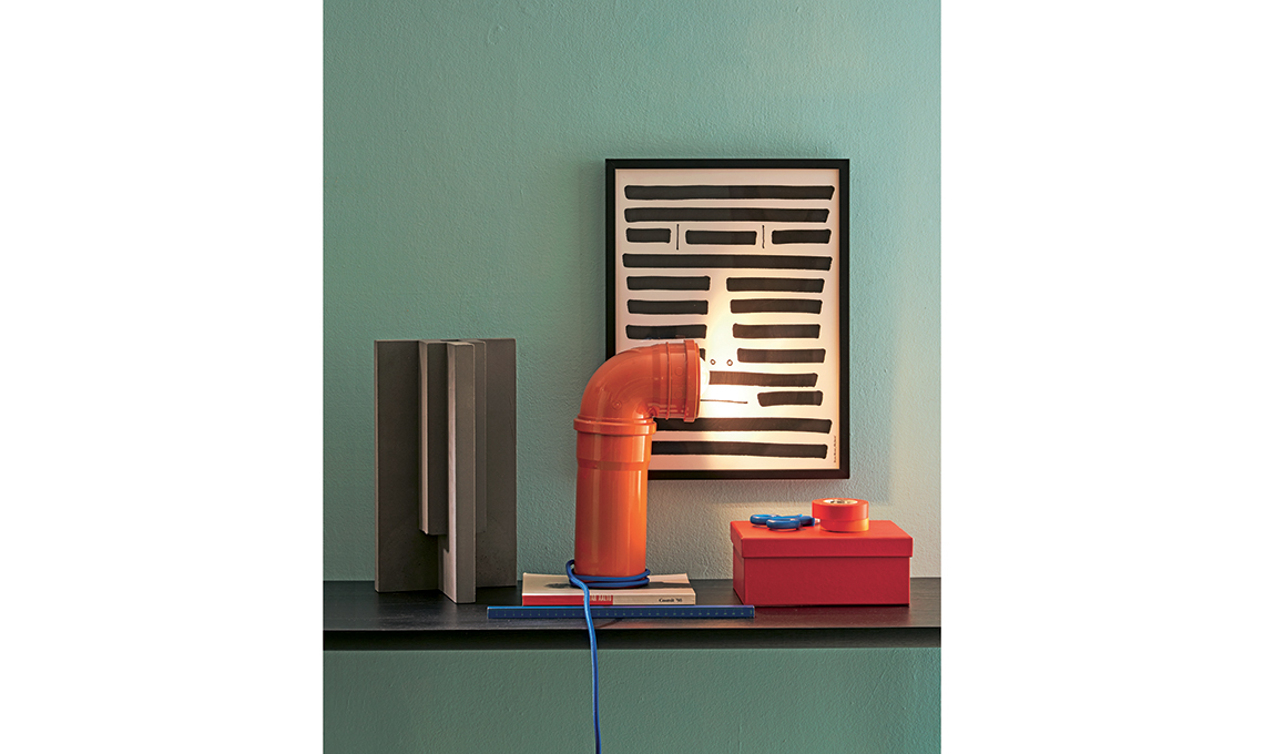 Puntano sul riciclo la box luminosa in Plexiglas® con la catena di lampadine e la lampada industrial con i tubi idraulici verniciati (usa l’aggrappante per la plastica prima di colorarli) illuminati all’interno con un portalampada.