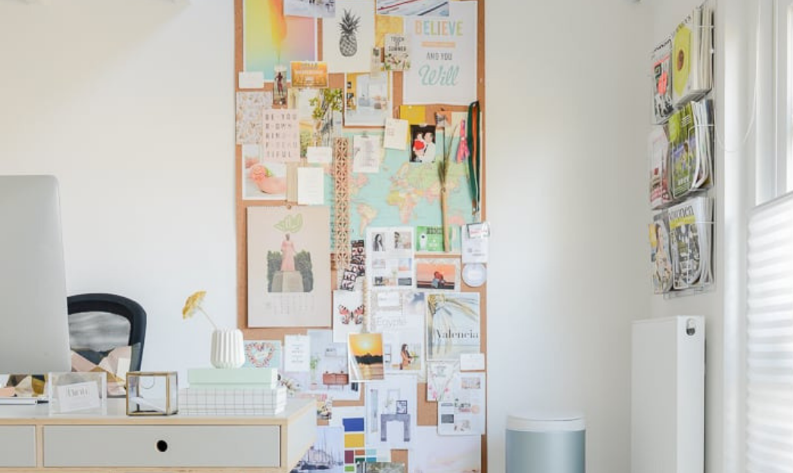 Per rinnovare un muro bianco sul quale non si possono apportare modifiche, un’idea geniale è quella di appoggiare un pannello maxi in sughero sul quale appuntare ricordi ed ispirazioni. Sarà la moodboard che accompagnerà il tuo soggiorno temporaneo dove, appunterai pensieri e cartoline.