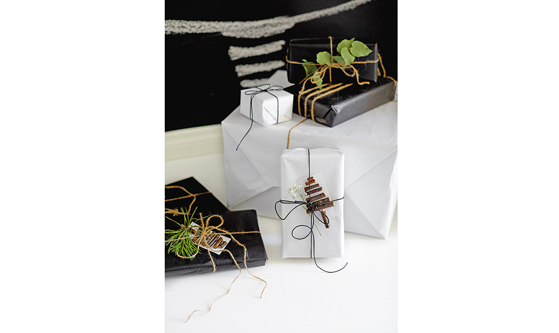 Per i pacchetti in black & white devi solo usare la fantasia, e per finire decorali con i bigliettini fai-da-te.