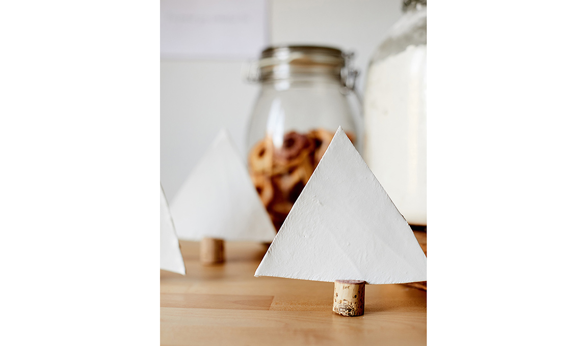 - Con il cutter taglia a metà un tappo di sughero, quindi realizza un’incisione in verticale. Incastra il triangolo di cartoncino nel taglio sul tappo, ottenendo un pinetto.