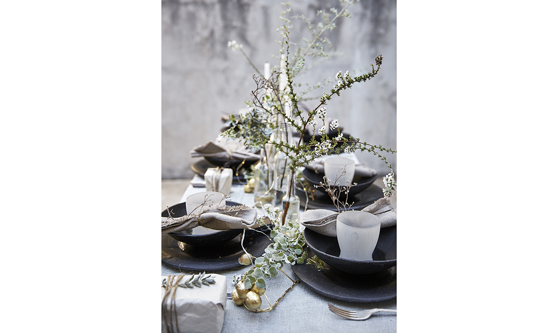Il Natale è la festa delle luci, stupisci i tuoi ospiti con un centrotavola insolito: disponi candele e rami in bottiglie di vetro trasparente per la lunghezza della tavola. Come dettaglio prezioso, aggiungi semi e bacche decorati con vernice dorata a spruzzo.