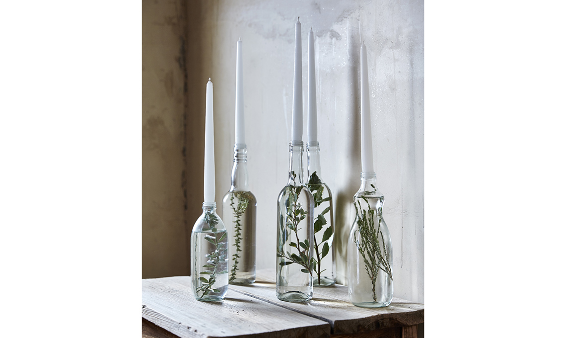 Usa bottiglie in vetro trasparente per creare semplici ma eleganti portacandele. Inserisci un rametto di abete, eucalipto, rosmarino o ulivo quindi riempile d’acqua. Il vetro rifletterà i giochi di luce e i rami daranno un tocco green al tuo décor.