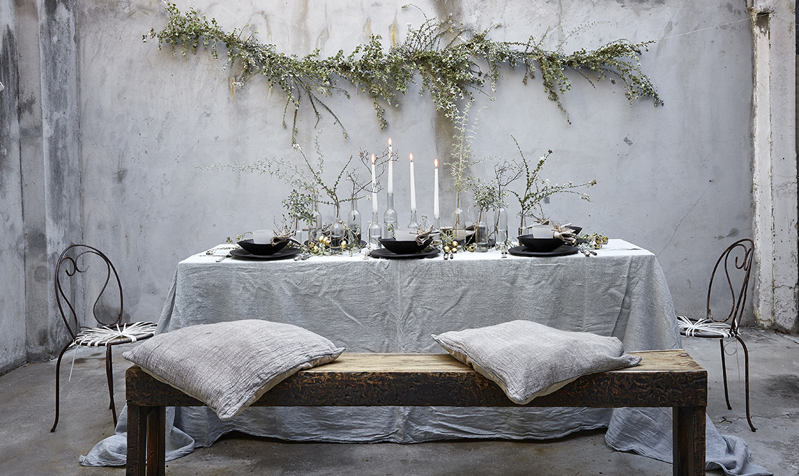 La bellezza naturale del lino sta anche nelle pieghe che regalano calore alla tovaglia e aggiungono un mood informale alla tavola. Per un effetto scenografico scegli una tovaglia abbastanza lunga da arrivare fino a terra.