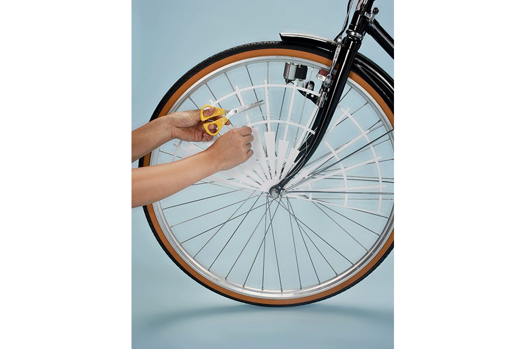 Come si fa: fissa ai raggi, utilizzando piccole porzioni di filo di nylon, i singoli decori. Su ogni ruota vanno agganciate due mezzelune, in modo da creare un'unica decorazione circolare. Fai attenzione che i decori aderiscano bene alla ruota per non intralciare il movimento!