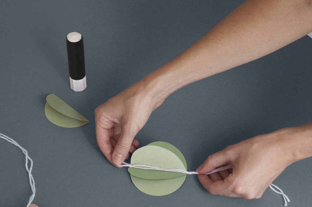Prima di incollare l’ultima mezzaluna, posiziona un filo di lana al centro della pallina, facendolo uscire da entrambi i lati e fai un nodino sopra e uno sotto