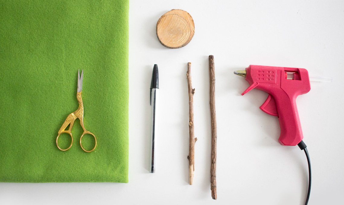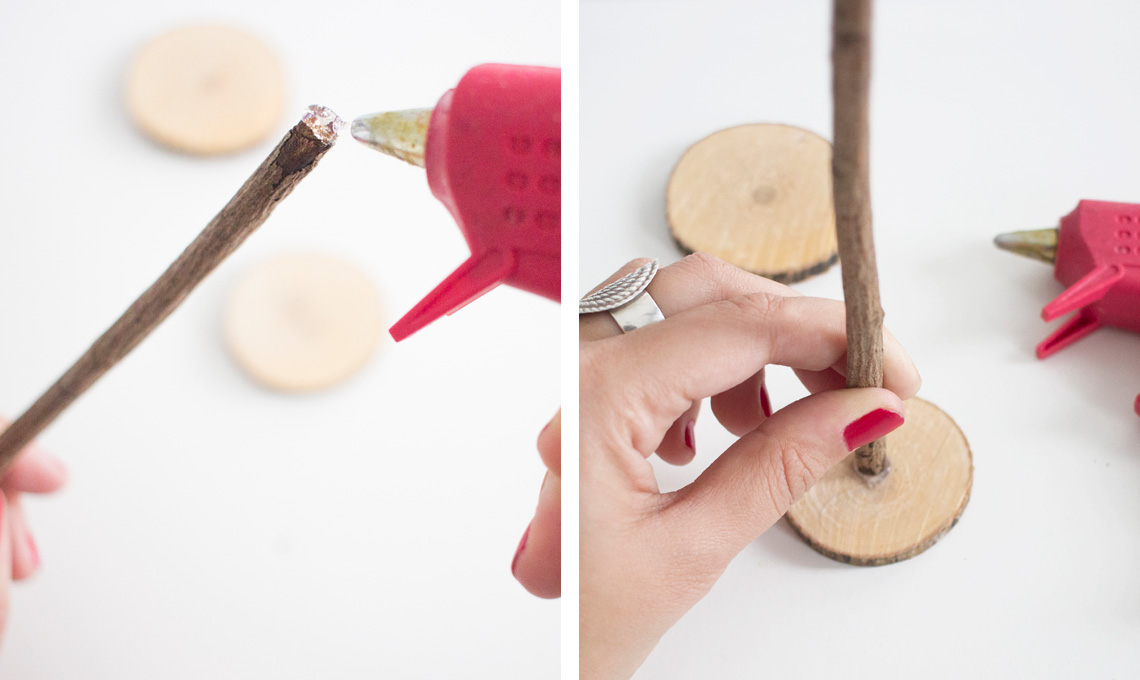 - Con la colla a caldo, incollare il rametto verticalmente al centro sulla base di legno rotonda.
