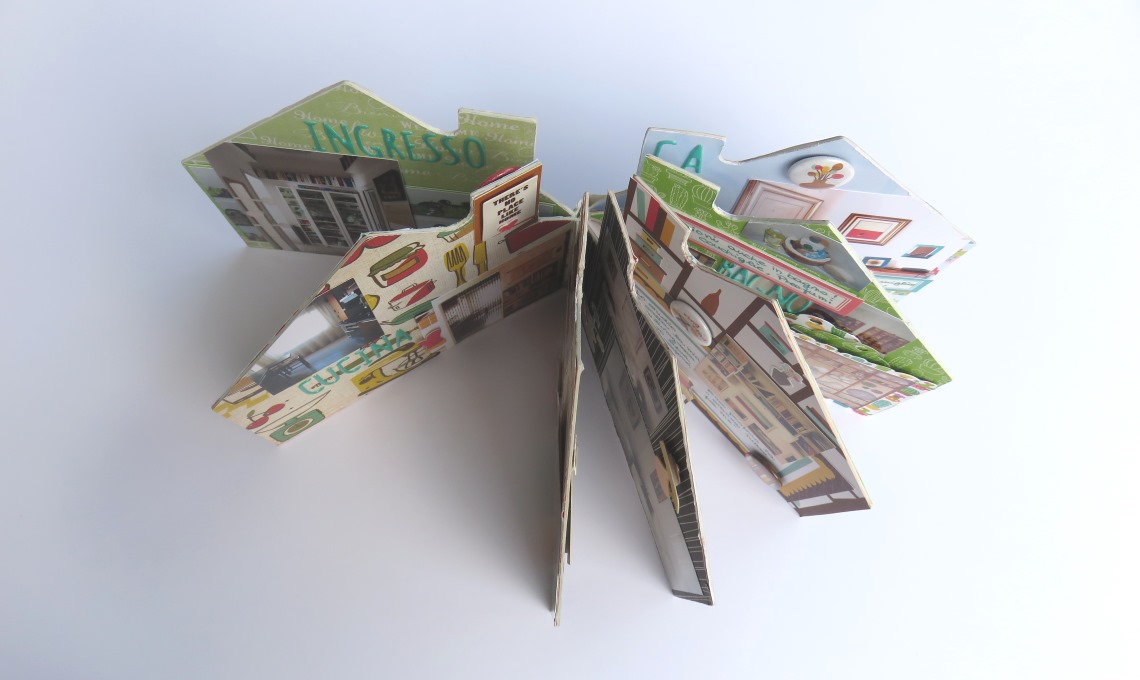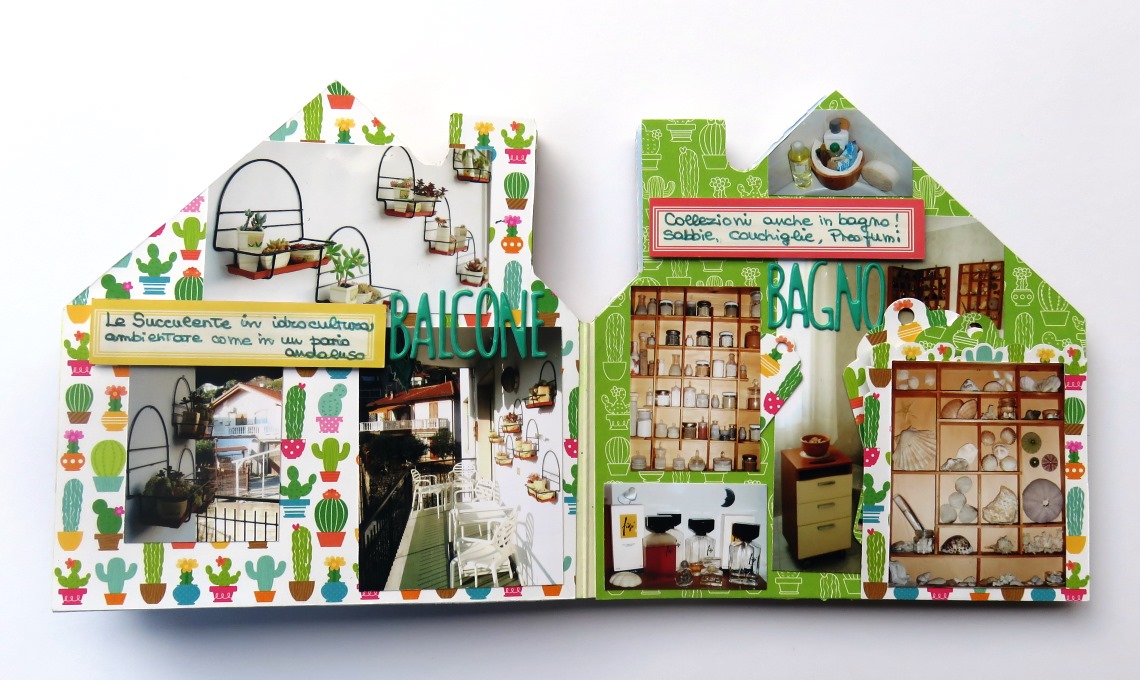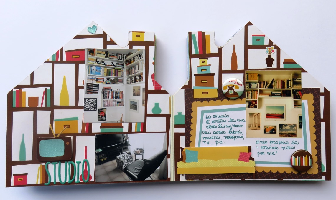 La particolare forma della base di cartone spesso, ulteriormente rinforzato dalla carta per scrapbooking incollata su tutte le facciate, dalle fotografie e dagli abbellimenti applicati con biadesivo spessorato, fanno sì che l’album possa essere trasformato in un elemento di home décor, appoggiato su un tavolino o una mensola, a ricordarmi che quella che sono è il frutto di tutte le esperienze passate e la mia casa di adesso deve qualcosa a tutte quelle in cui ho vissuto prima.