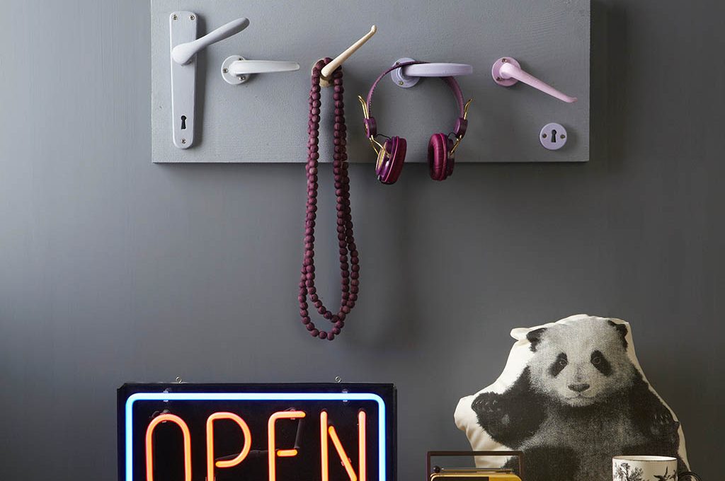 Un'idea veloce e low cost. Dipingi con colori trendy delle vecchie maniglie riciclate, avvitale a un asse e appendi. Il gioco è fatto!