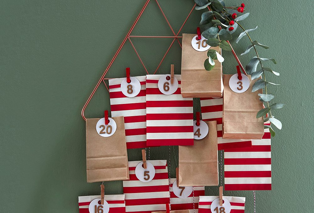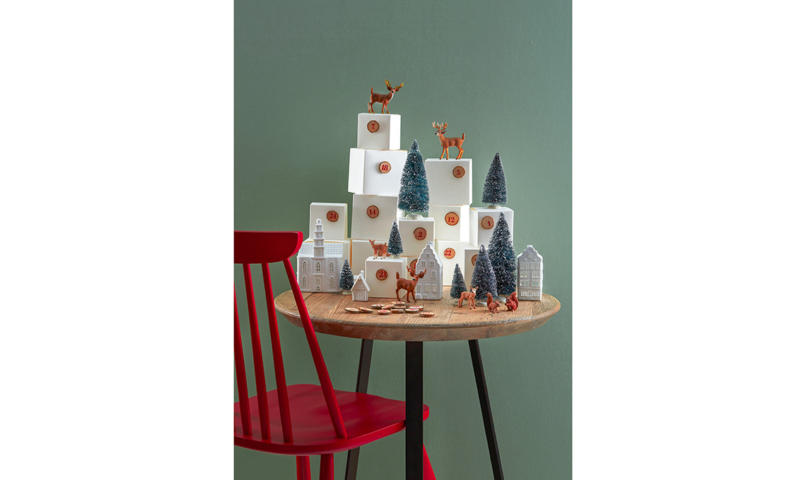 sedia con struttura in legno di faggio e finitura laccata rosso [Dialma Brown, cm 46x53x89h]. tavolo in legno vecchio riciclato con base in metallo finitura ferro brunito [Dialma Brown, ø cm 70]. casette decorative di ceramica portacandela [&klevering].