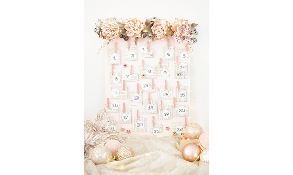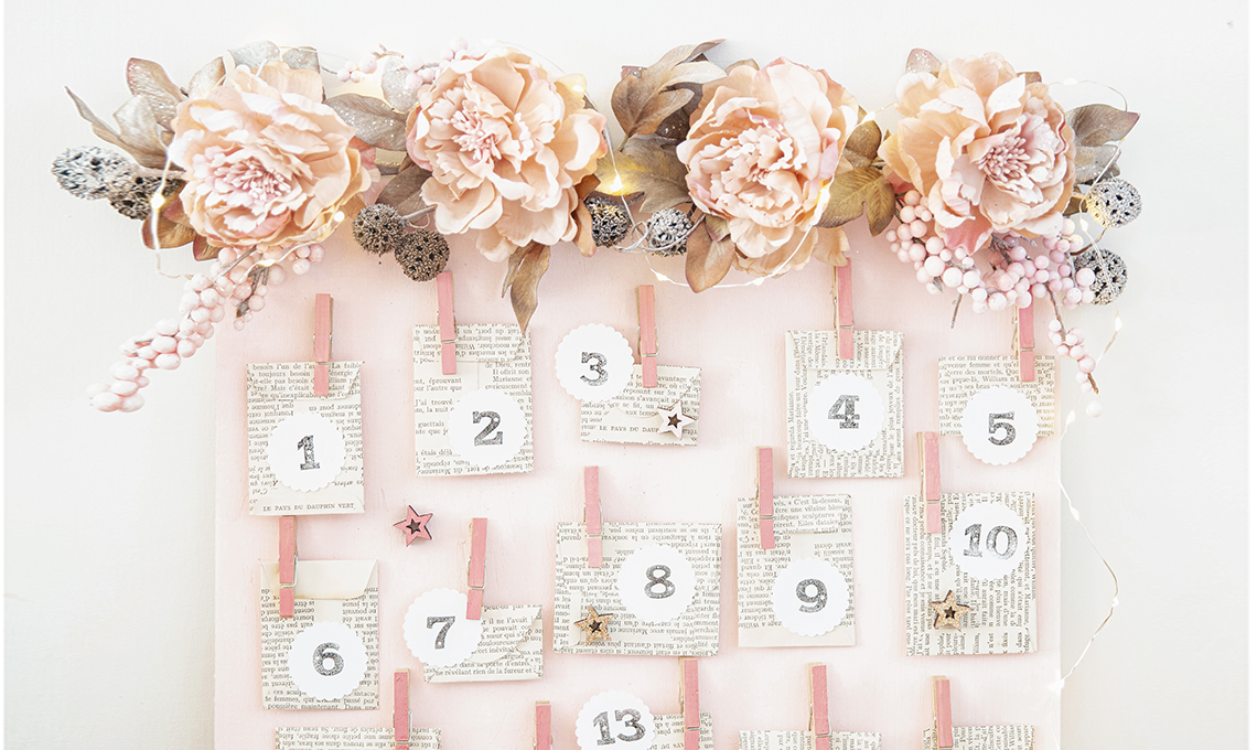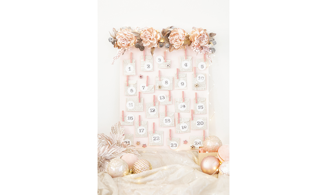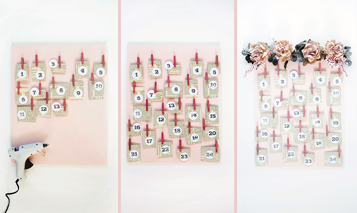 - Incolla i fiori di tessuto con la colla a caldo nella parte superiore della tavola di legno, aggiungi le altre decorazione in legno per arricchire il calendario.
