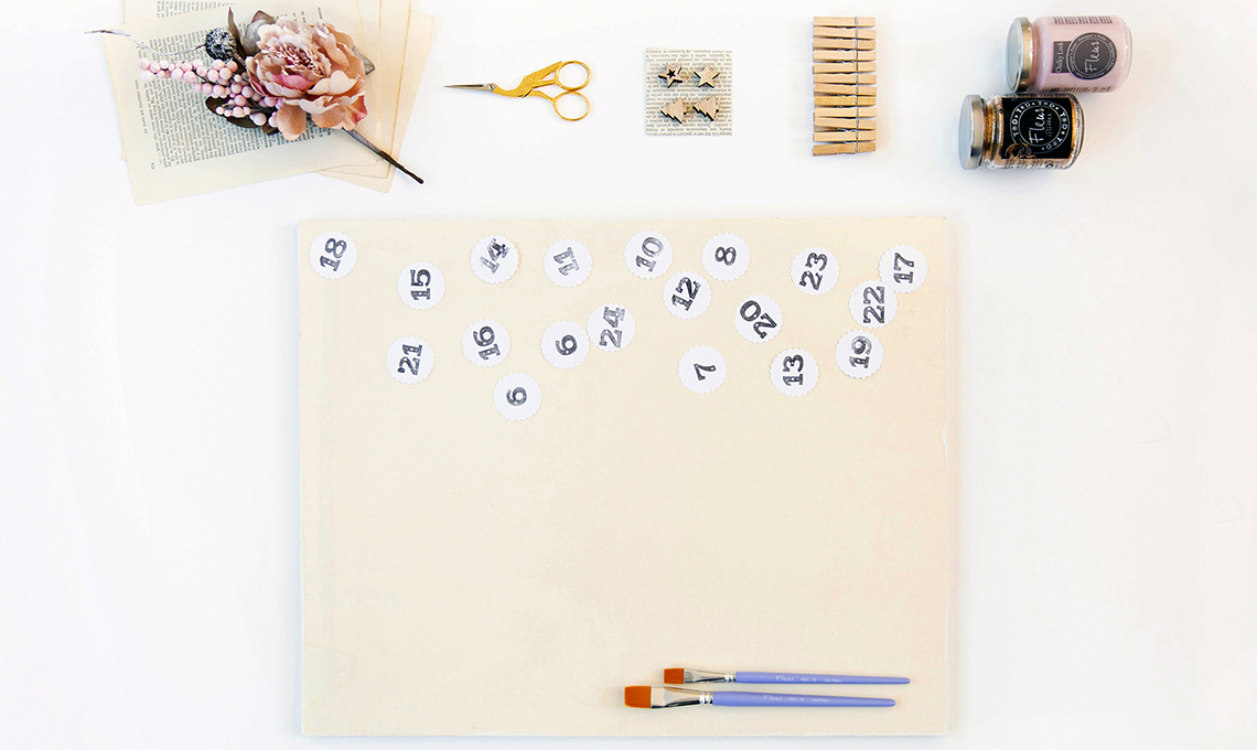 - Con il pennello piatto (n°16) dai un mano di vernice Fleur Chalky Look colore Pretty Ballerina alla tavola di legno. Lascia asciugare e dai una seconda mano di pittura. Con il pennello piatto (n°10) dai una mano di vernice Fleur Chalky Look American Beauty anche alle mollette e alle figure di legno. Per un effetto brillante e il linea con il mood natalizio, puoi utilizza anche i glitter.