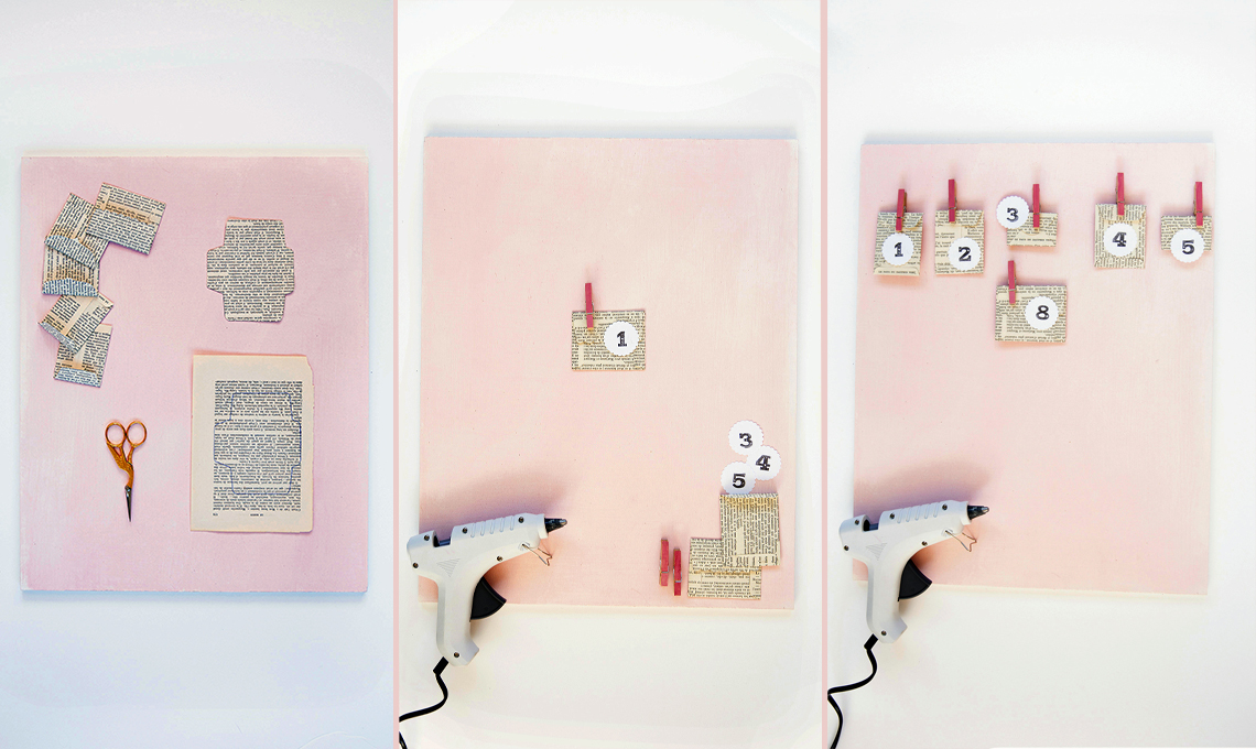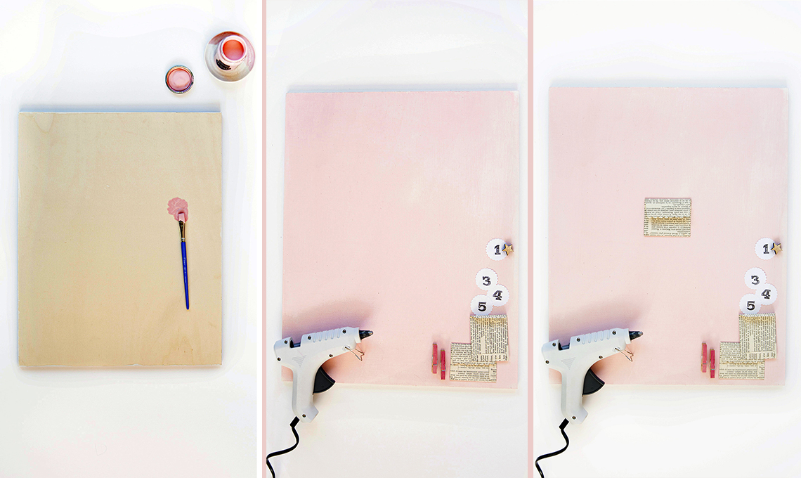 - Pinza i sacchiettini alle mollette pitturate di rosa. Con la colla a caldo, fissa le mollette alla base di legno e inserisci le buste, stando attenta a lasciare i giusti spazi.