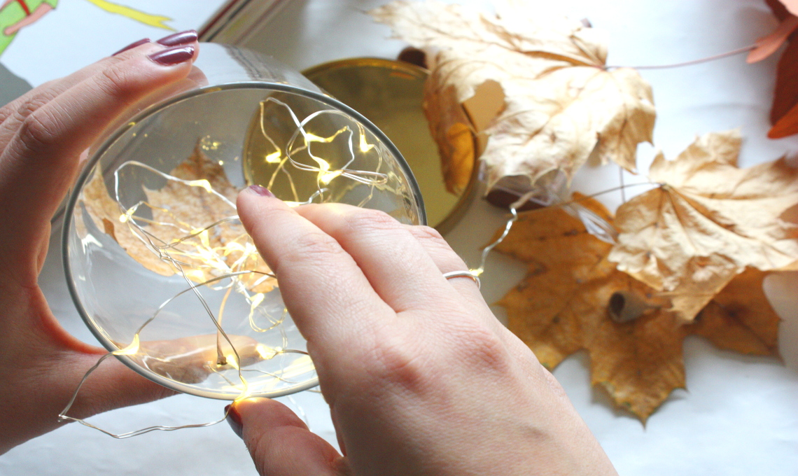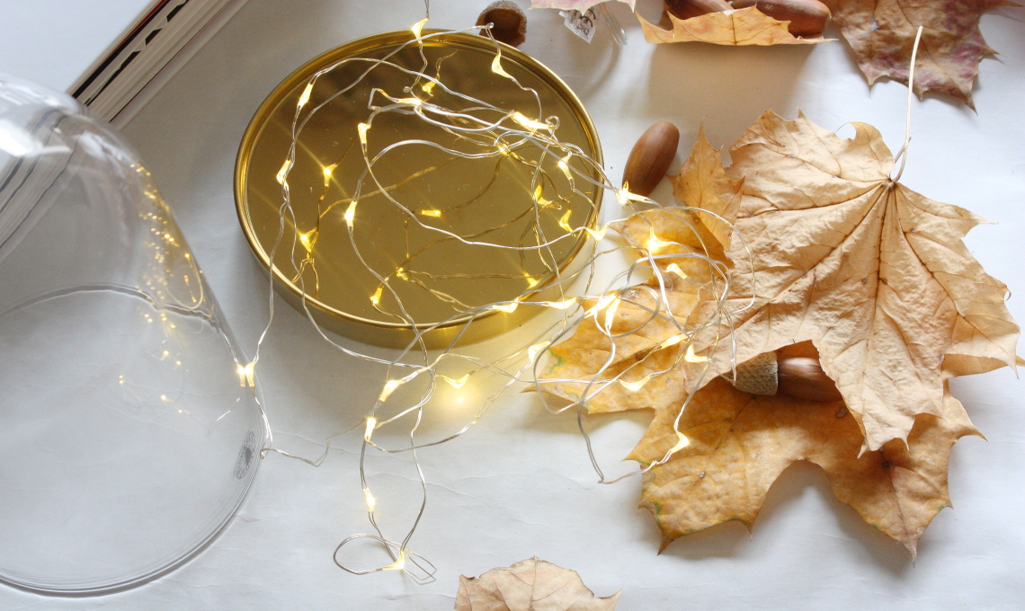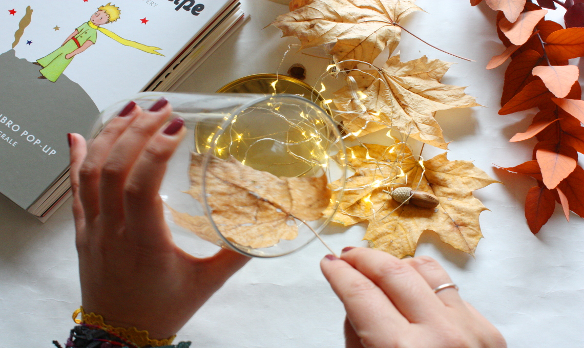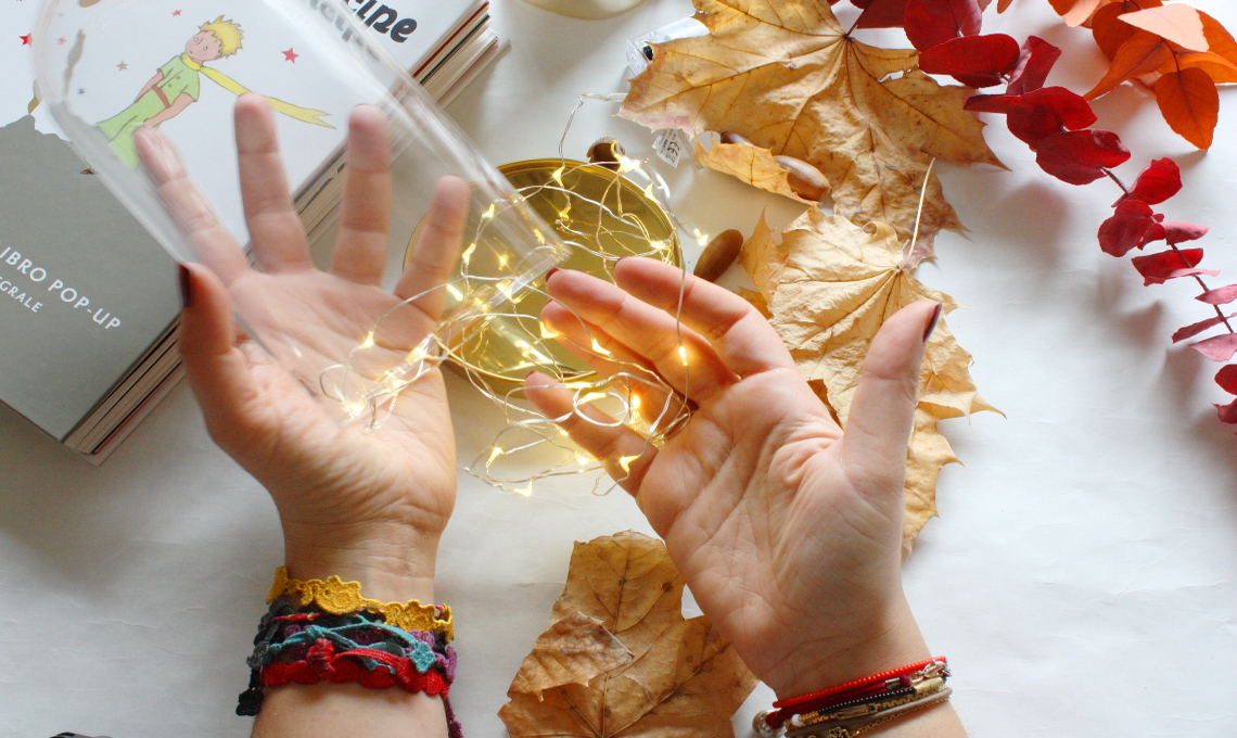 Il giorno dopo voliamo insieme verso casa, Milano. Una volta arrivata, la posiziono sul coffee table fronte divano. Prendo la mia sottile fila di lucine, una manciata di foglie secche (ne ho sempre una scorta grazie al parco vicino a casa) per aggiungere un pizzico di magia, et voilà: il mio cielo stellato è pronto ad accogliermi!