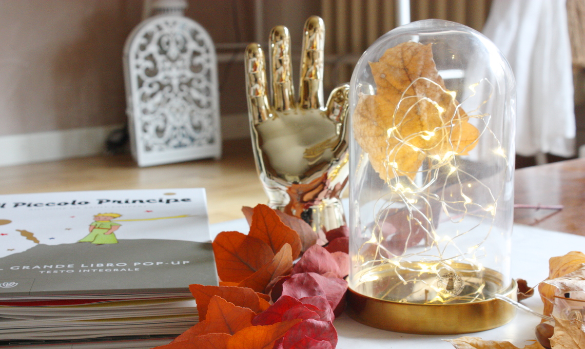 È circondata da bellissimi barattoli in vetro di ogni forma e dimensione ma, nella composizione, qualcosa “non torna”. Mi avvicino per guardare meglio ed eccola lì: una bellissima campana in vetro con base dorata. Proprio quella che la mia immaginazione aveva iniziato a disegnare pochi minuti prima!