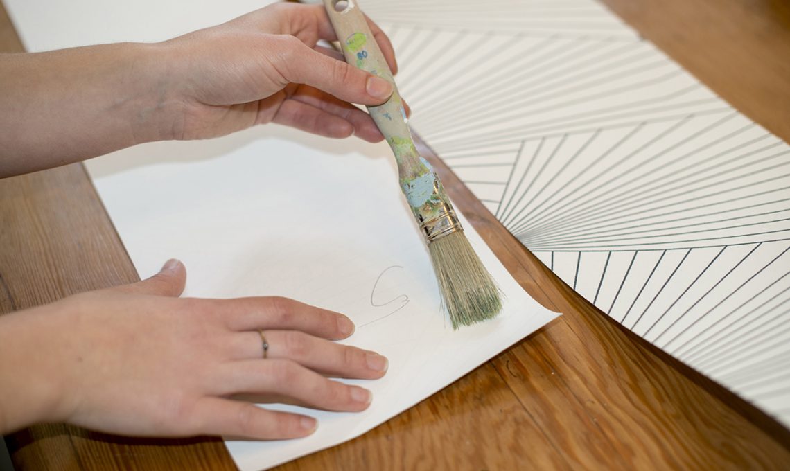 Applica sul retro della carta il nastro biadesivo lungo tutti i profili, o stendi la colla vinilica con il pennello e fissa – stendendo bene con le mani affinché non si formino bolle – ogni striscia alla madia.