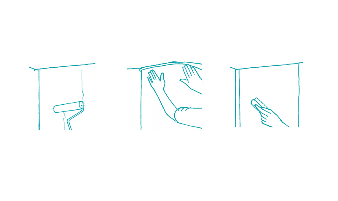 - In base al tipo di carta, stendi la colla sul muro con il rullo per una fascia larga quanto il telo, o sul retro della carta con il pennello dal centro verso l’esterno.