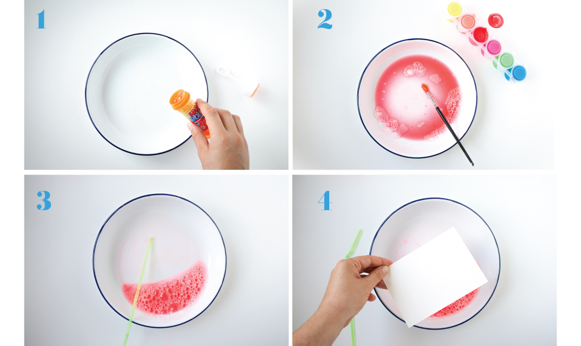 - Inclina un po’ il piatto e con l’aiuto di una cannuccia soffia sul liquido in modo che si formino delle bolle più o meno grandi