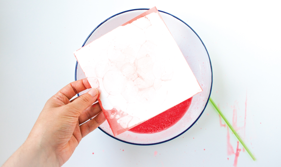 - Velocemente prendi il foglio di carta e appoggialo in modo delicato sulle bolle, che scoppieranno e lasceranno l’impronta sul foglio
