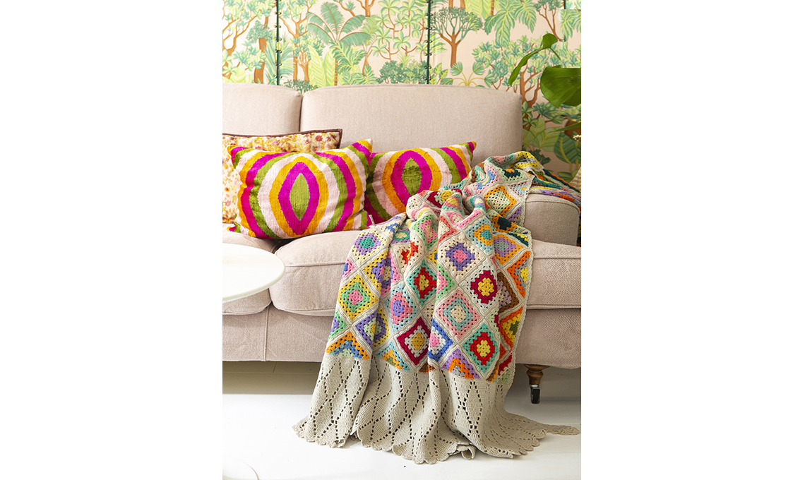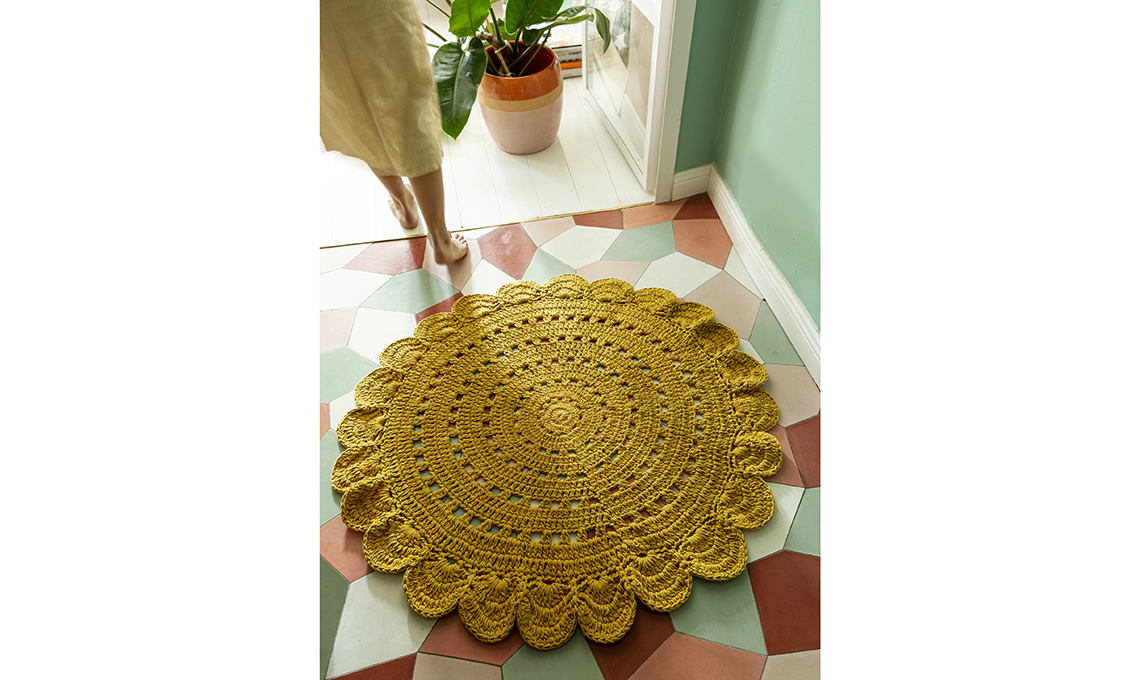 Maxi size il tappeto rotondo realizzato a mano con la classica lavorazione a crochet. L’ispirazione viene dai centrini vintage da tavola di una volta, riletti in chiave contemporanea. Abbinamenti inediti: il tappeto a crochet in senape spicca sulle tinte pastello delle cementine.