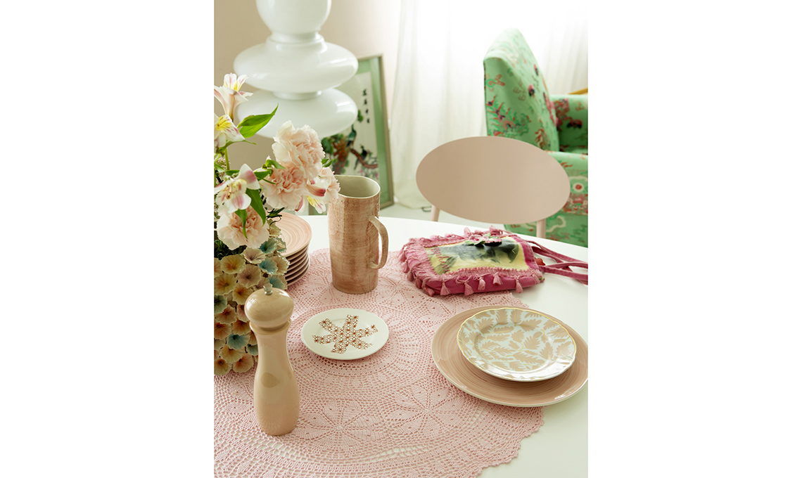 Il classico centrino di pizzo è stato realizzato a mano con i disegni tradizionali, ma con un filo tinto in un’inedita nuance rosa bonbon.