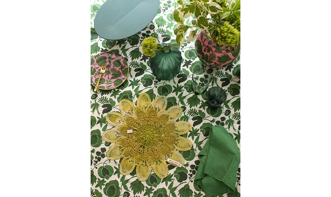 Centrino dipinto a mano [realizzato da Dequoration]. tovaglia in lino con decoro foglie, vaso Bubble in porcellana e piattino dessert [La DoubleJ]. posata dorata [Sambonet]. vaso in vetro verde [Maisons du Monde]. alzata Tellina in ceramica colore verde [Paola C.]. bicchieri [High Tech].