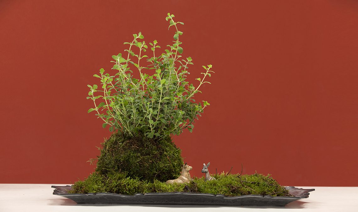 Una volta pronto, puoi appoggiare il kokedama in un piatto o un vassoio oppure legarlo con un filo di nylon e appenderlo in modo da creare un giardino sospeso di mini bonsai.