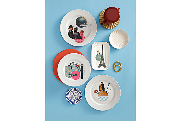 Ritaglia le carte decorate e le stampe e, giocando con le sovrapposizioni, realizza sui piatti i collage.