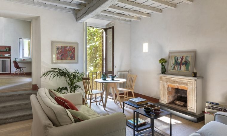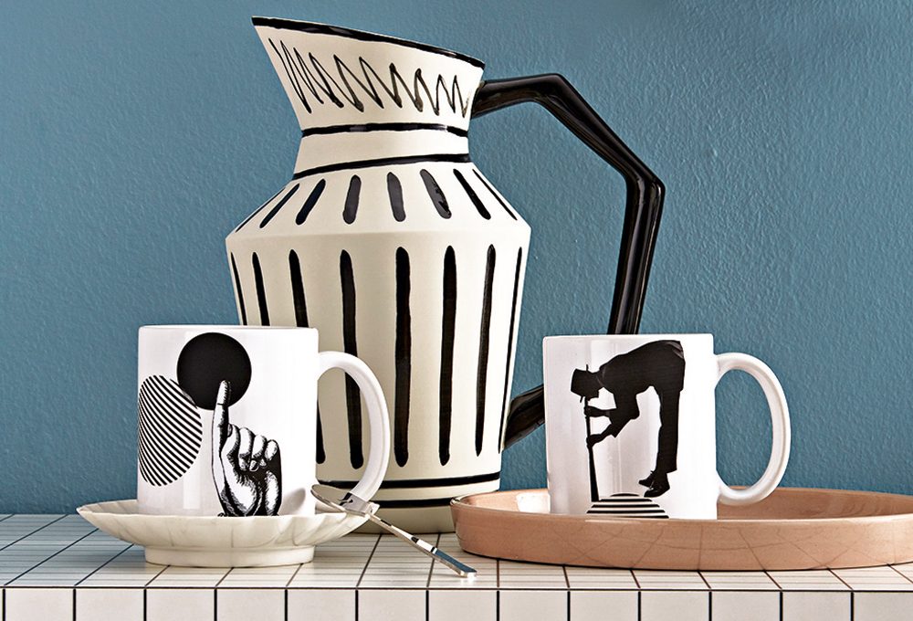 come lo sgabello Mezzadro, disegnato da Achille e Pier Giacomo Castiglioni. lampada da tavolo Kaiser Idell e candelabro in acciaio smaltato [Fritz Hansen]. bottiglie in ceramica decorate a mano [Kose Milano]. Tappeto Esagoni [Amini Carpets].