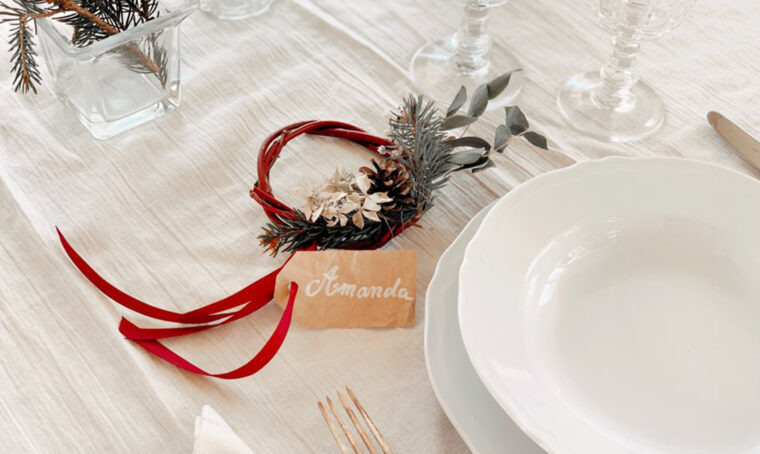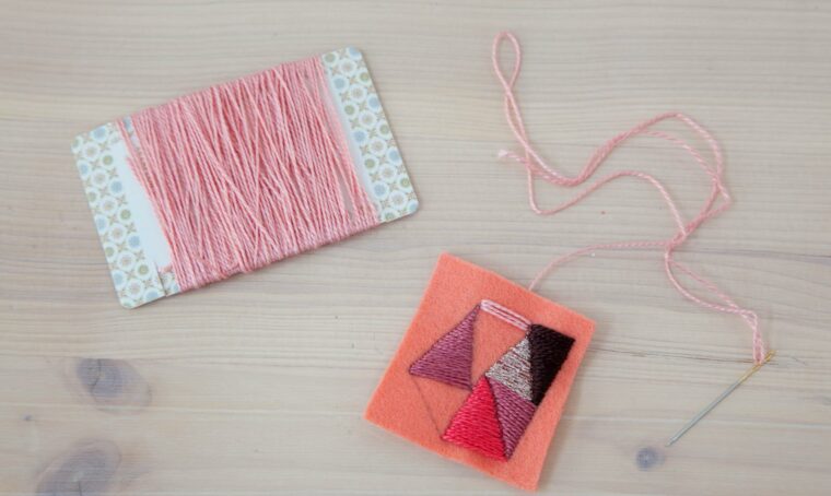 - Taglia un nastro di gros grain (o cannetté) in misura del doppio dell’altezza di 2 cornici più 80 cm circa. Infila il nastro in un anello di ottone e piegalo a metà.