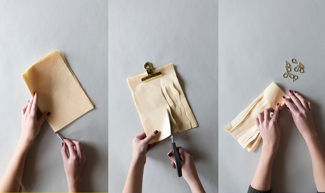 4. Una volta ottenuti 12 fogli della dimensione desiderata, fissali con una pinza fermacarta nella parte superiore e inizia a tagliare delle listarelle di circa 1,5 cm di spessore, creando linee ondulate.