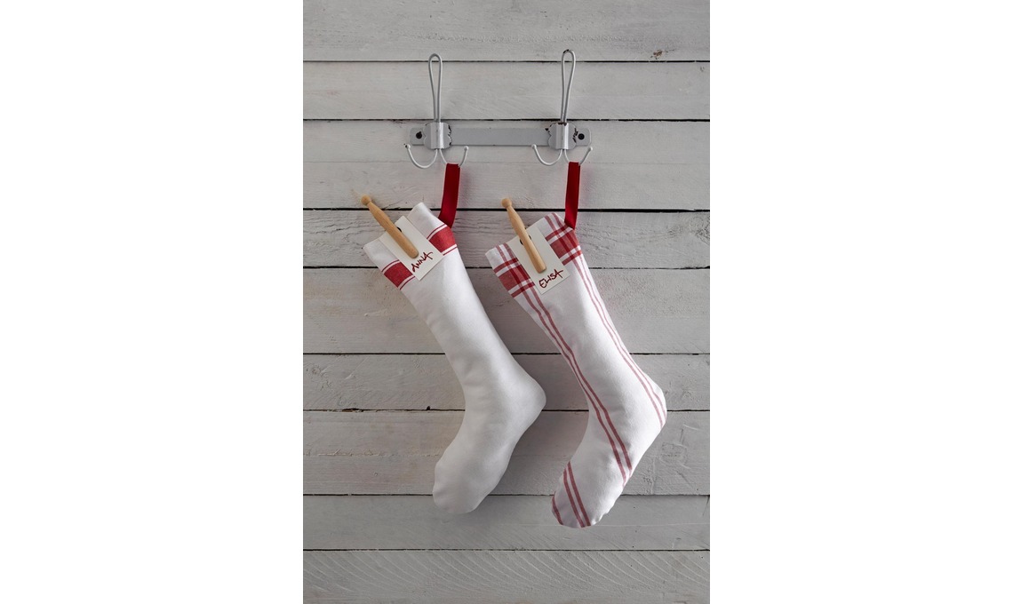Disegna la sagoma della calza e riportala sul rovescio del canovaccio. Taglia a 5 mm dal bordo. Realizza anche l’altra faccia della calza, con il cartamodello sul diritto del tessuto. Sovrapponi le sagome, diritto contro diritto, fissa il profilo con gli spilli e cuci. Lascia qualche centimetro aperto, inserisci la fettuccia per appendere la calza e termina la cucitura. Rivolta la calza al diritto.