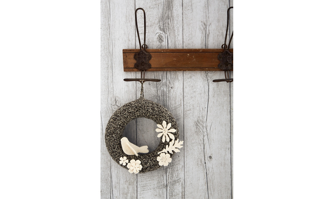 occorrente: √ 2 gomitoli da 50 g di filato ‘Perfetto’ colore #P8181 di Mez Cucirini √ uncinetto n.4 √ ago da lana √ ghirlanda di polistirolo ø cm 22 √ feltro bianco