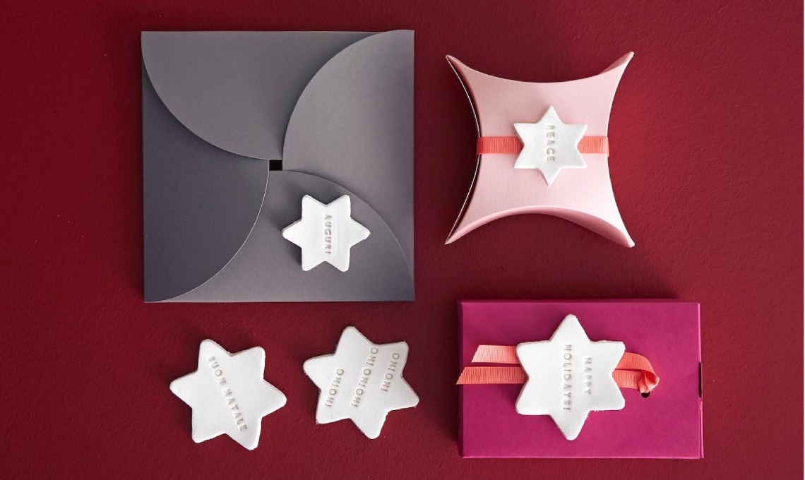 • Con lo stampino per biscotti taglia le stelline. Componi le scritte e imprimi le scritte sulle stelline.