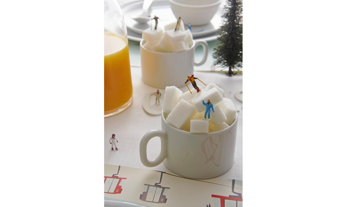 √ Disponi sulla tavola, nelle tazze da tè, le zollette di zucchero come se fossero blocchi di neve e decorale con le miniature da modellismo degli sciatori. Completa con tanti pinetti decorativi e disponi le lettere di cartoncino con la scritta preferita.
