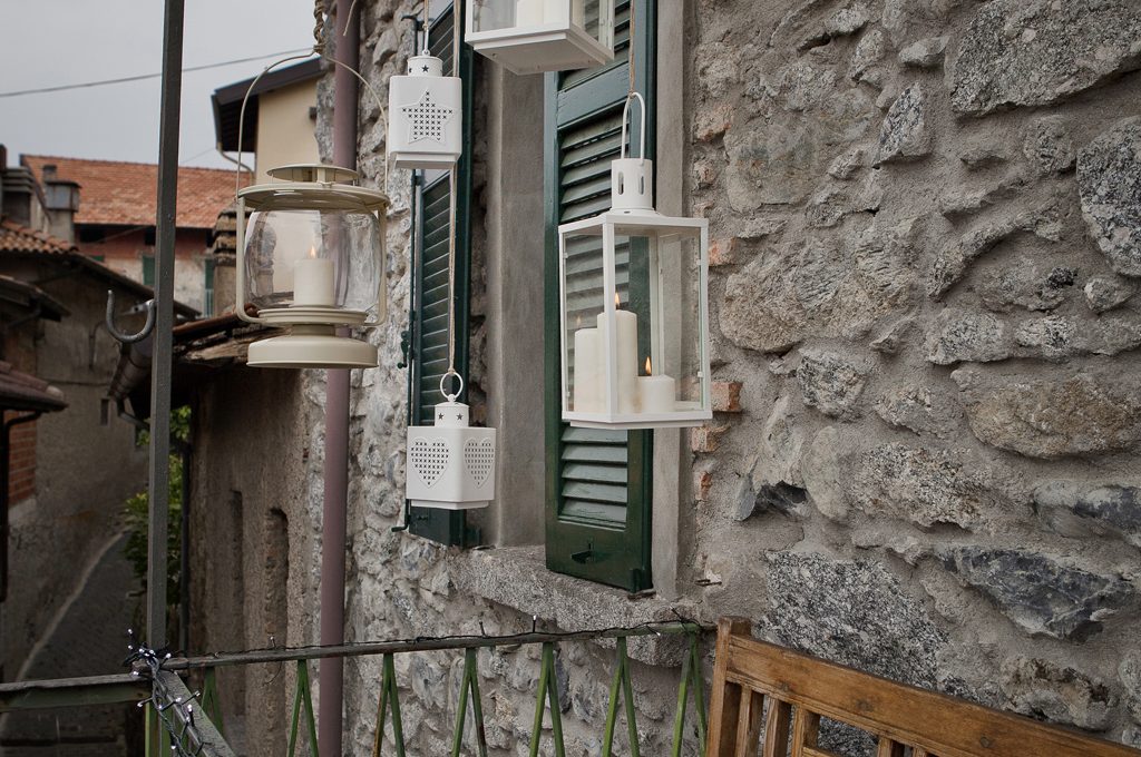 Candele scenografiche anche all'esterno, protette dalle lanterne di CoinCasa e Ikea! Sul balcone della casa in pietra, pendono dalle zanche delle vecchie tende