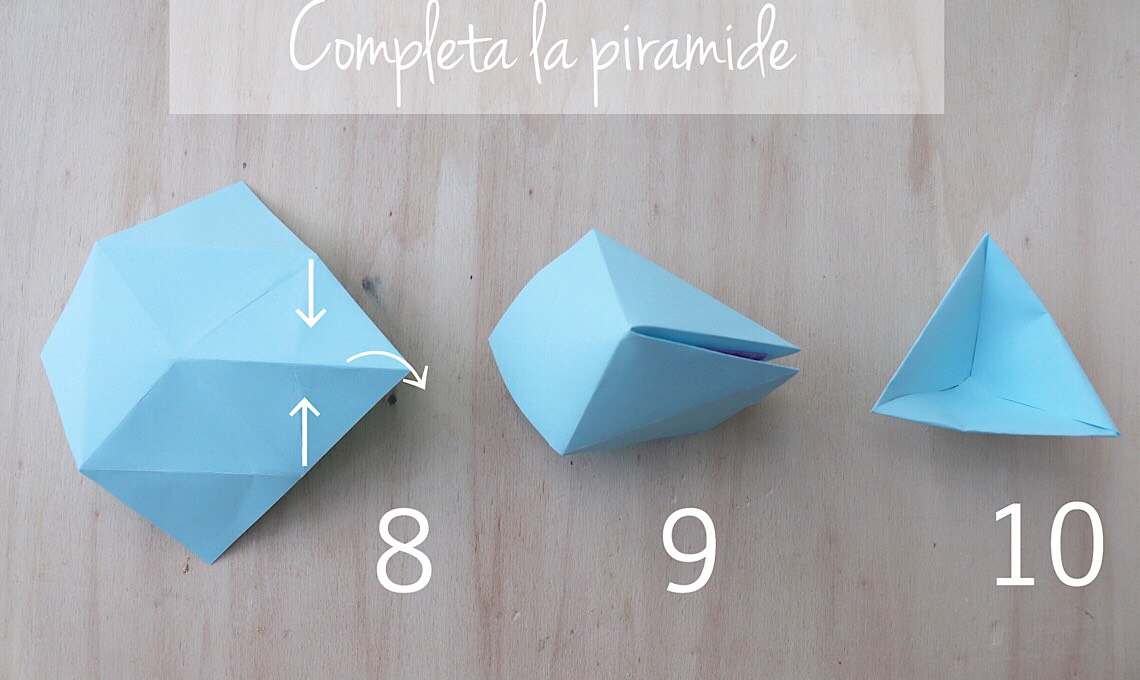 3. Apri la figura, e spingi la piegatura ottenuta verso il basso facendo combaciare i due lati opposti (8) tenendo la carta al di sotto della piramide tra indice e pollice (9).
