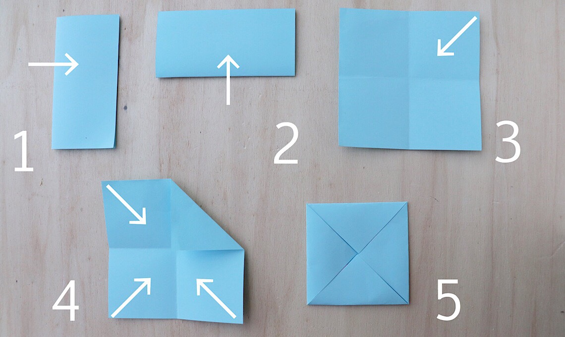 Piega il foglio prima a metà in verticale (1) e poi in orizzontale (2) avrai così ottenuto due piegature perpendicolari che si intersecano al centro del foglio (3). Porta l’angolo in alto a destra al centro della figura (4) ripeti l’operazione con gli altri 3 angoli (5).