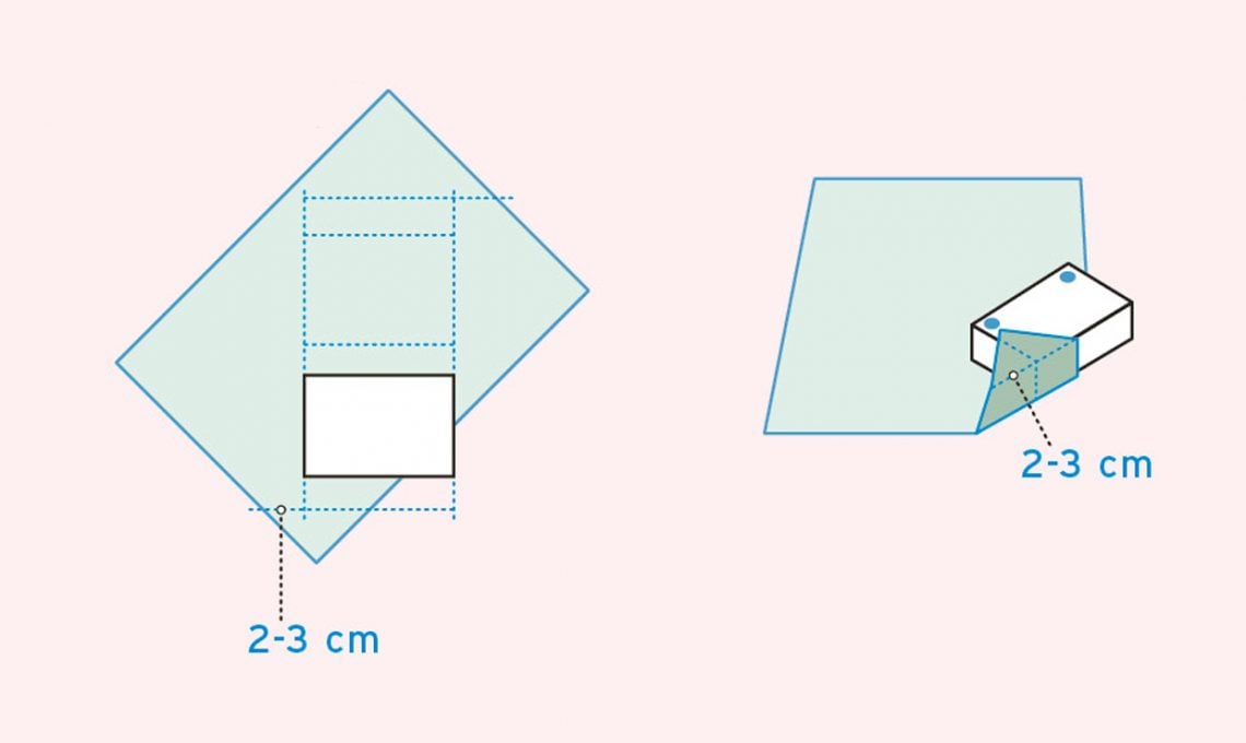 1 Accertati che i tre angoli del libro (evidenziati con il puntino blu) siano sul rettangolo di carta. Posizionalo come vedi nei disegni, con la copertina rivolta verso l’alto e 2-3 cm di margine dal bordo inferiore.