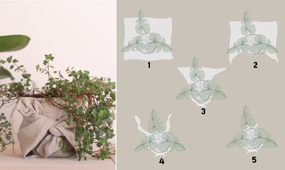 - Gira il vaso e procedi sul lato opposto nello stesso modo: una prima piegatura a coprire il vaso e poi chiudi sovrapponendo le due ali laterali con un altro nodo.