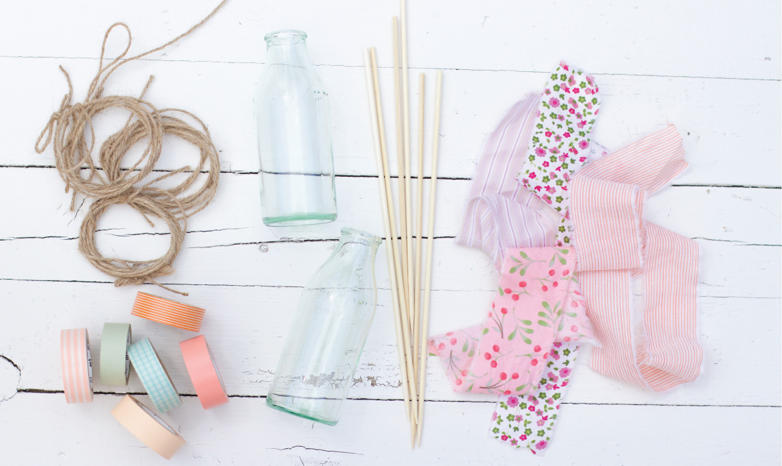 - Decora ogni bottiglia con stoffe diverse ma con sfumature di colore simile per un effetto cromatico armonico